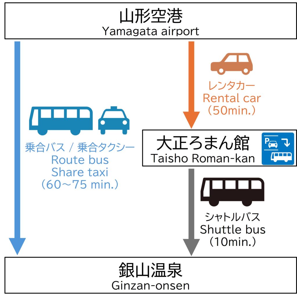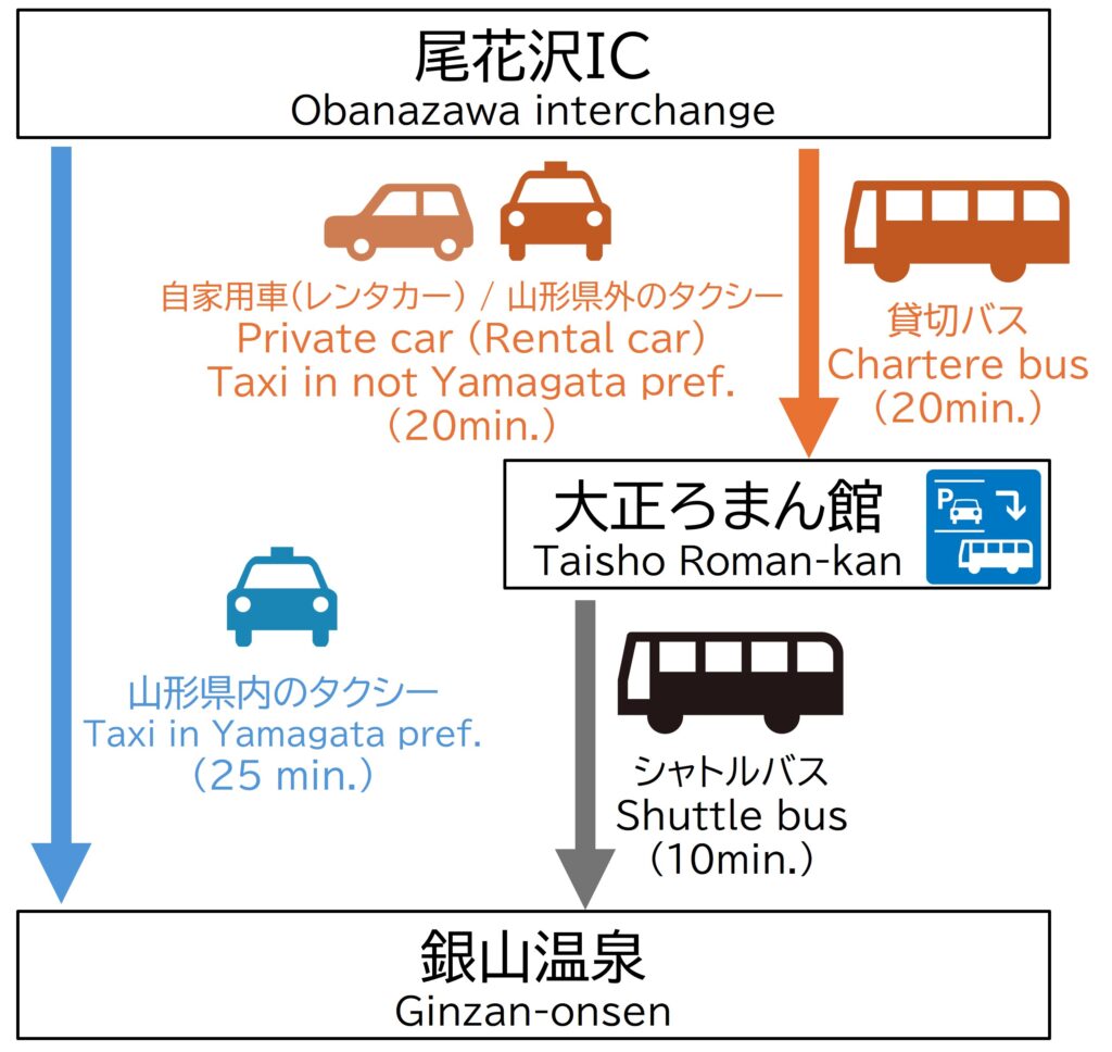 山形県内のタクシー事業者をご利用の場合を除き、大正ろまん館でのパークアンドライドとなります。
